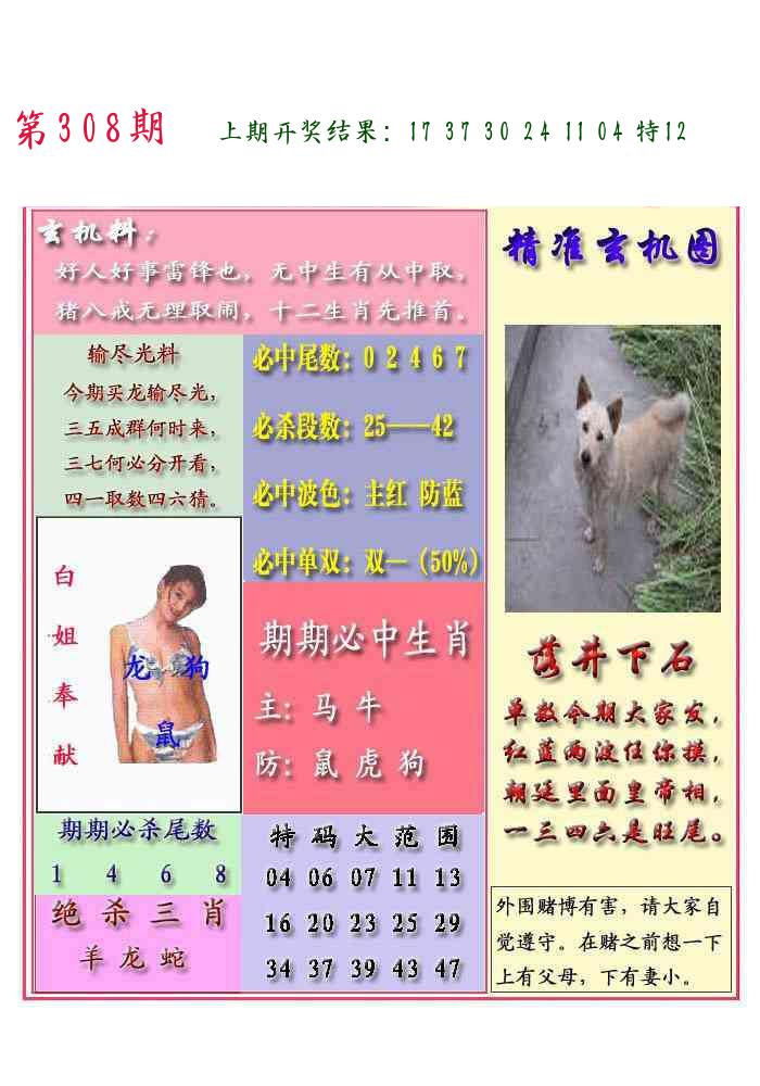 304期绝杀1.肖1.尾 【狗肖4尾】 开 42鼠对  |